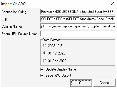 If Phototicket is running on the same computer as IdealPOS, the following settings can be used to import product data: